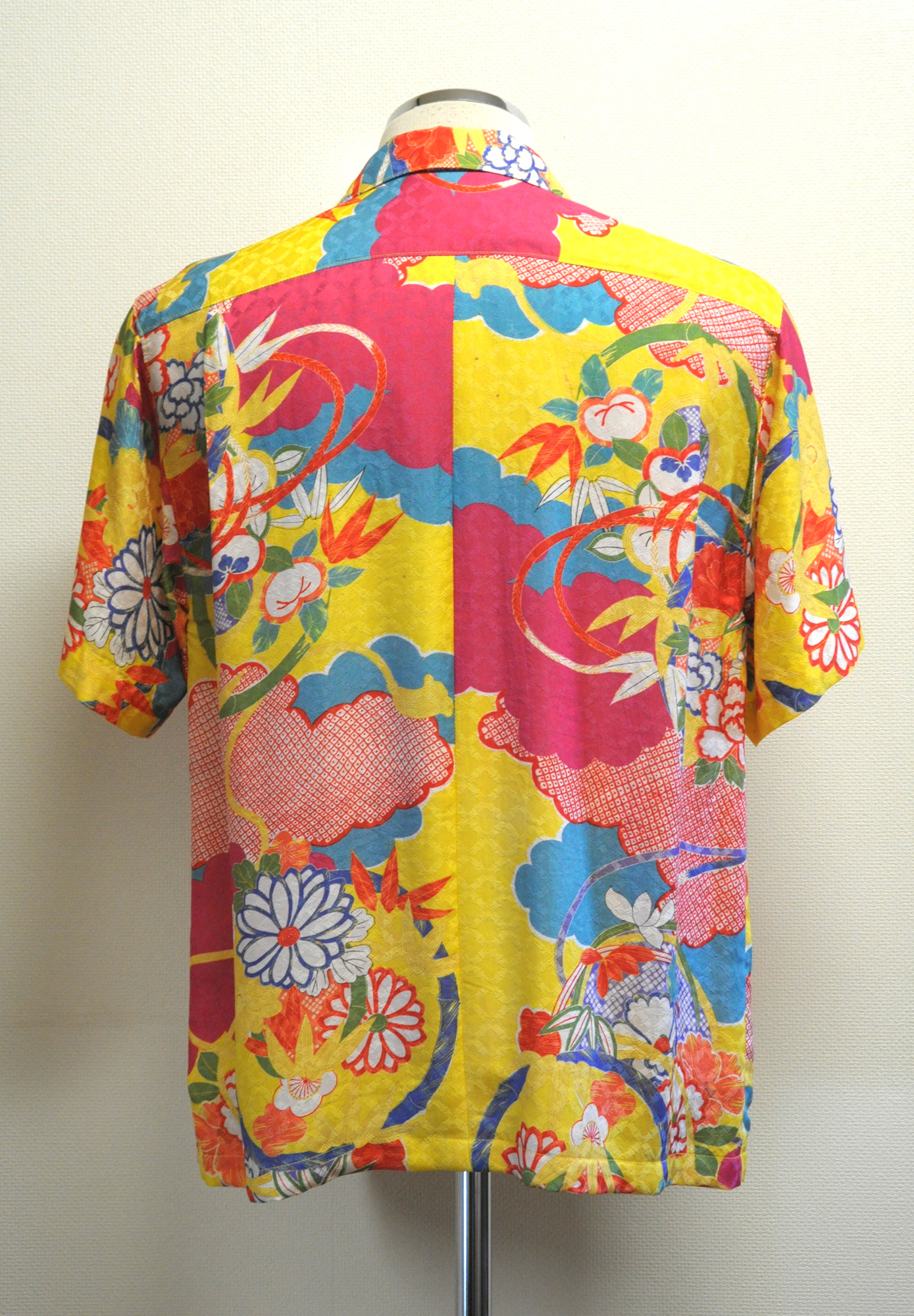 鮮やかなイエローに全面竹格子の綸子、ポップで賑やかな一着。