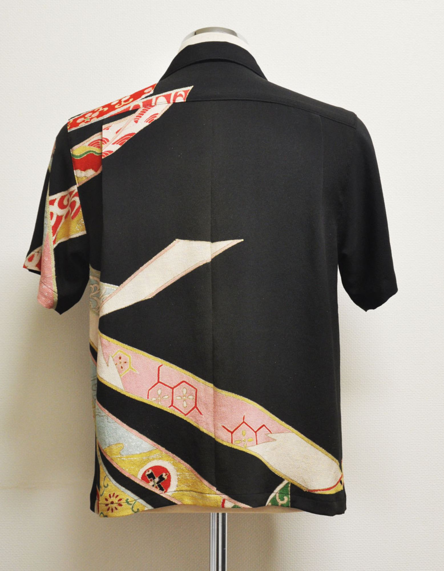 左肩から始まりぐるりと右前まで柄を繋げ附下げ風に仕上げた一着。 おめでたい柄行に素材はチリチリ。