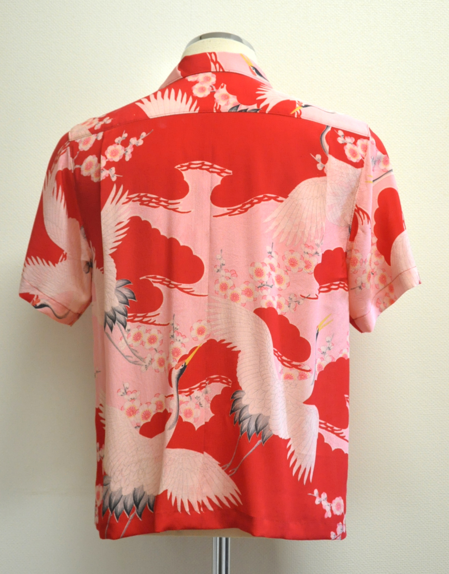 定番中の定番、赤地に鶴の吉祥文様。つがいの鶴が松梅の中、仲良く舞っております。