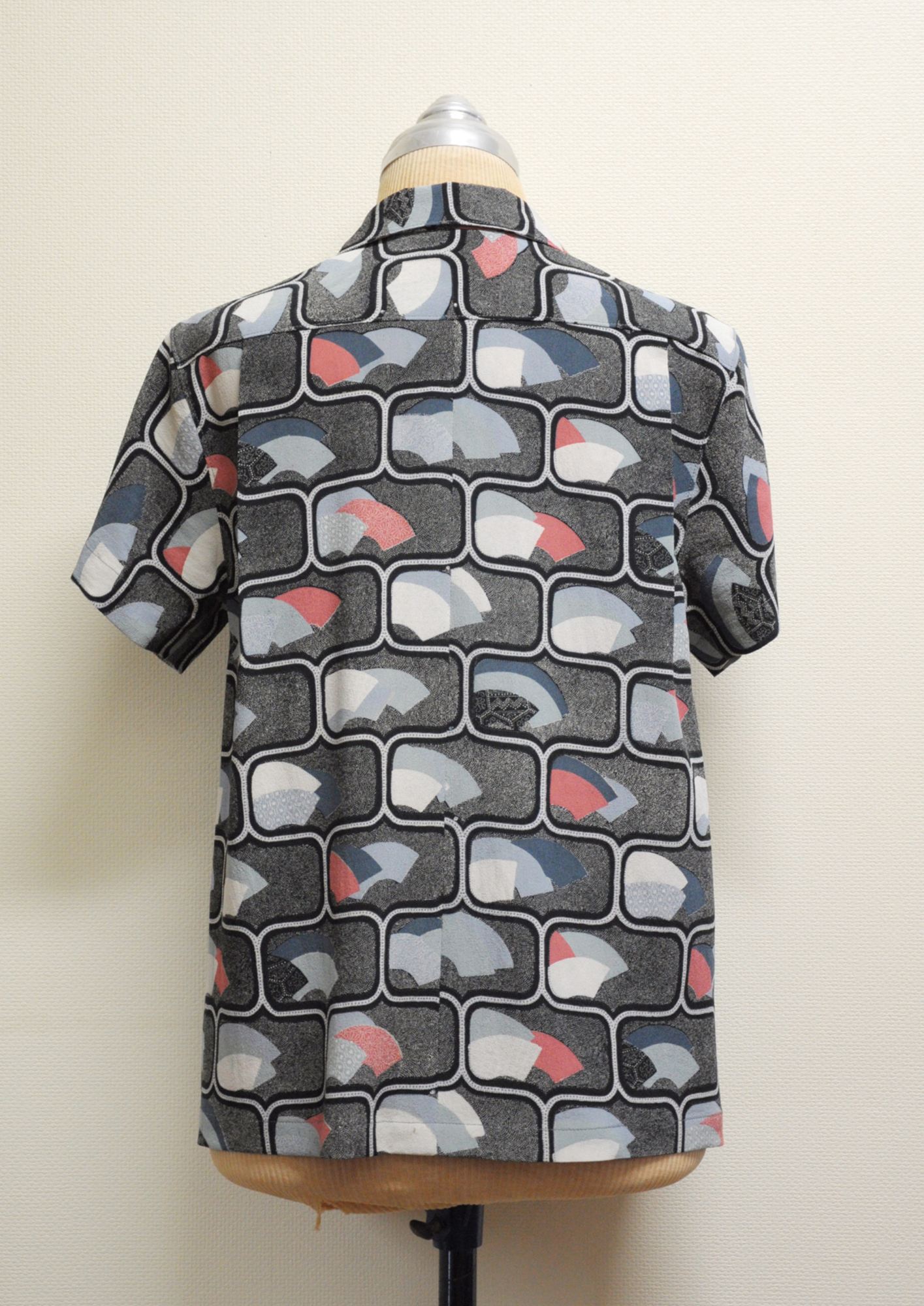 鮫小紋地にグラフィックデザイン。着物状態で見つけた時はぶっ飛びましたがシャツに落し込むとシックリきました。