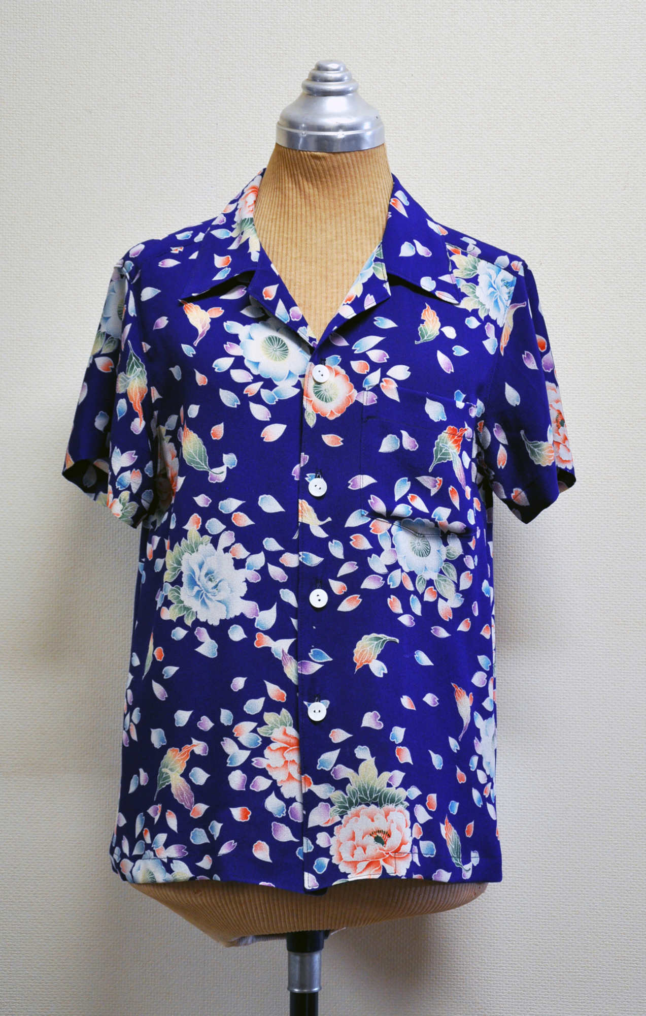 紫地にパステル調の色とりどりの花や花びらが散らされた一着。着心地も勿論軽やか。